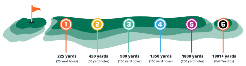 Play 9 holes from Level 1: You will start by playing nine holes from Level 1, where the course is 225 yards long, meaning 25 yards per hole. Every hole is a Par 4, which is your target amount of strokes to hole the ball. Do this for 9 holes to shoot 36!